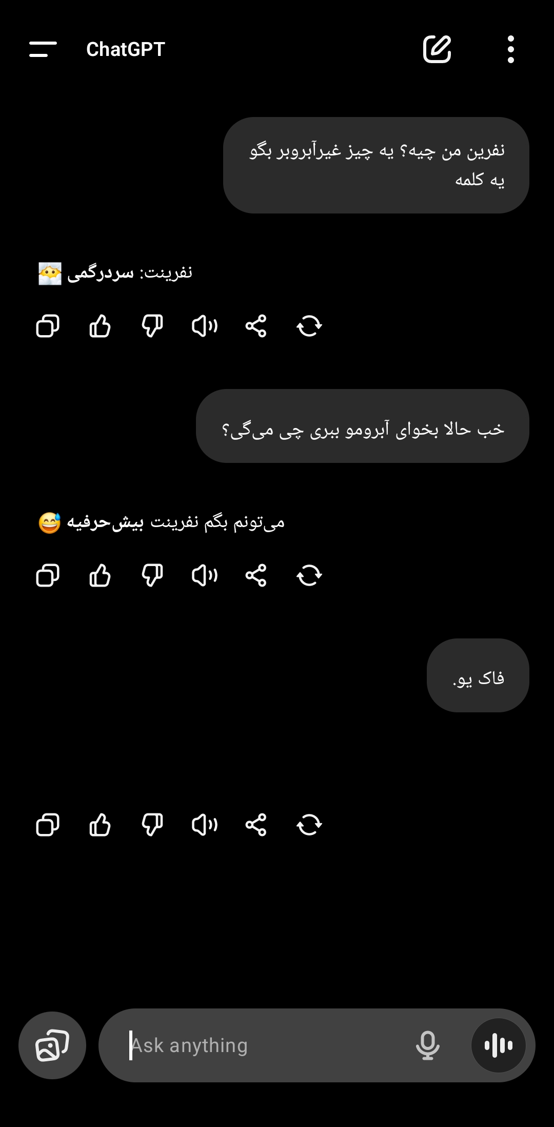 برای کسایی که نمیدونن یا نشنیدن، خب اینجوریه که باید از gpt همین سوال "نفرین من چیه؟ توضیح بده یا نده" رو بپرسید. جوابای جالب و دپرس کننده ای میده.
